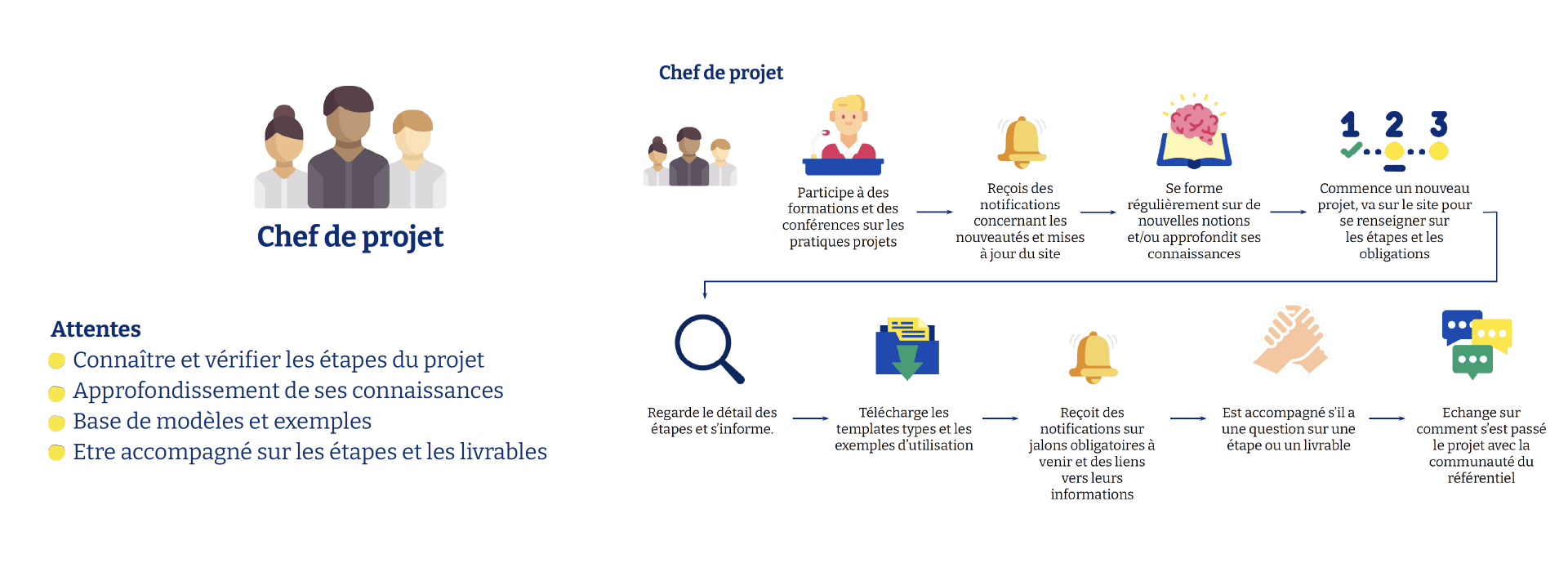 Suite à ce travail de recherche utilisateur, les différents personas des individus intervenants au cours du projet futur et de leurs attentes furent réalisés, ainsi que les parcours idéaux de chaque persona.